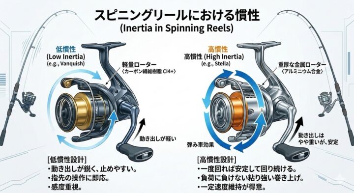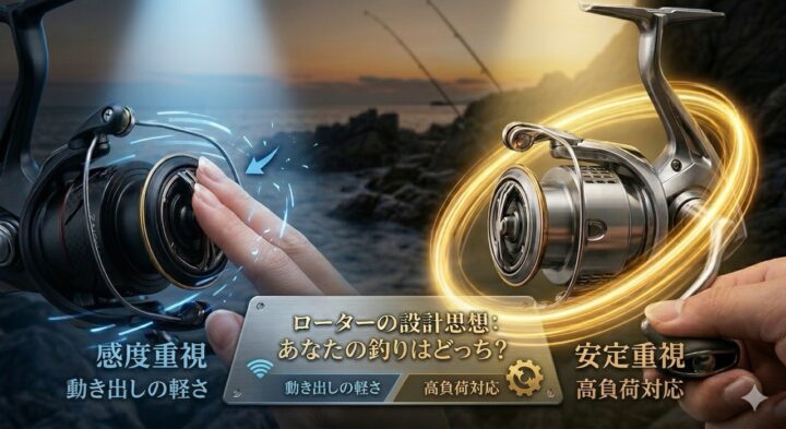 リールの性能は単なる「自重の軽さ」だけで決まるのではありません。実は回転体(ローターやハンドル)の設計思想によって、その性格は180度変わります。